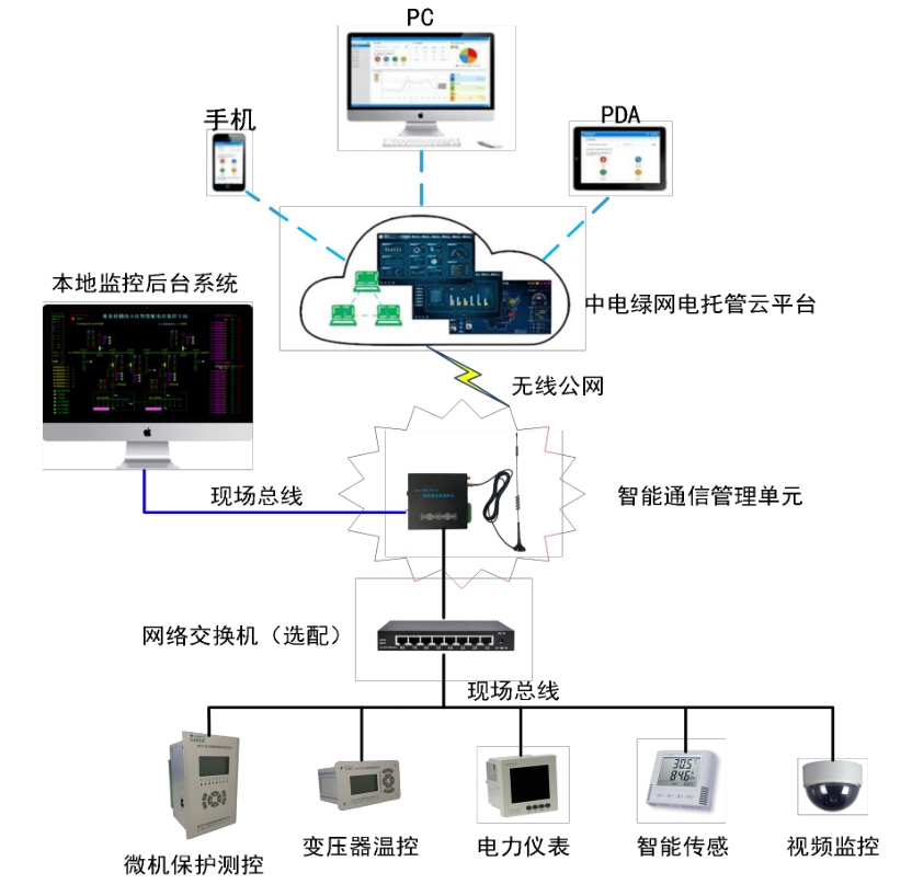 1. 【采集站內智能設備信息】—— 通過 485 串口總線或以太網通信等方式與站內的智能設備(微機保護裝置、電力儀表、測控裝置、站內模擬盤、直流屏、主變溫控裝置等)進行通信,接收處理并轉發(fā)智能設備上送的各種信息。
